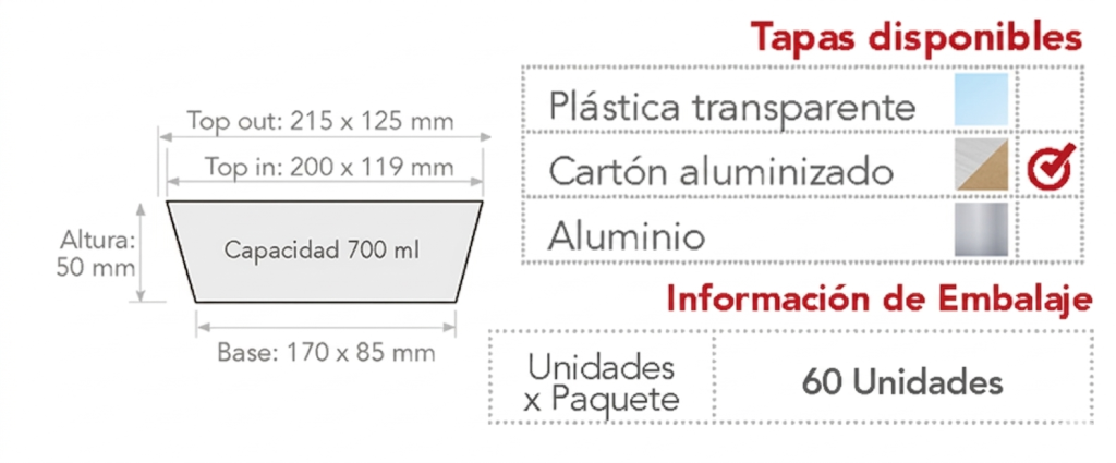 Disponible con tapa de cartón aluminizado grado alimenticio, por lo tanto mantiene la temperatura y por lo cual es ideal para empacar comidas calientes.