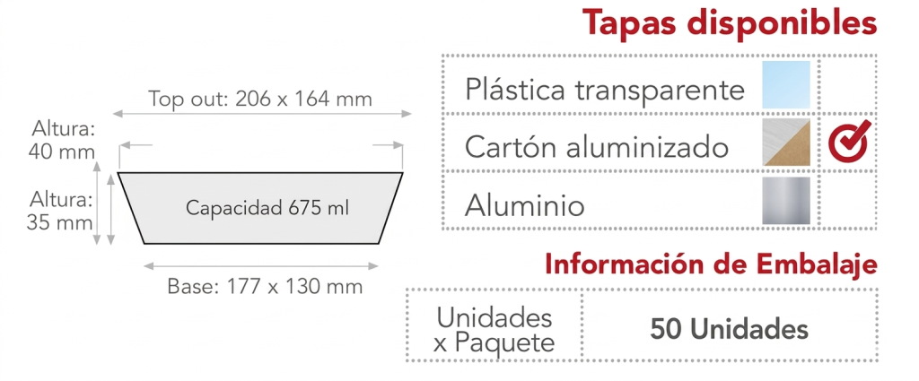 Disponible con tapa de cartón aluminizado, lo que ayuda a mantener la temperatura y es grado alimenticio. Es un recipiente desechable de un solo uso, microhorneable y de fácil manejo.