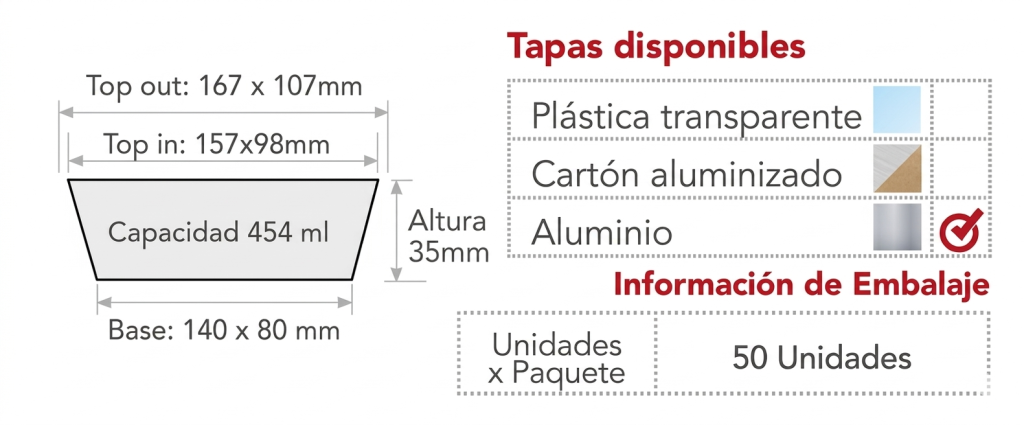 Disponible con tapa de aluminio,por lo tanto mantiene la temperatura y por lo cual es ideal para comidas calientes, además las tapas tienen perforaciones para la sudoración por temperatura